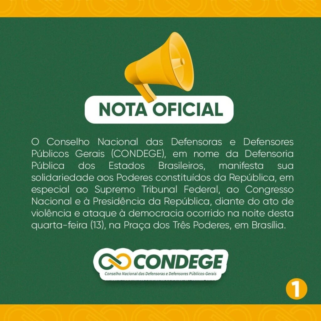 O Conselho Nacional das Defensoras e Defensores Públicos Gerais (CONDEGE), em nome da Defensoria Pública dos Estados Brasileiros, manifesta sua solidariedade aos Poderes constituídos da República, em especial ao Supremo Tribunal Federal, ao Congresso Nacional e à Presidência da República, diante do ato de violência e ataque à democracia ocorrido na noite desta quarta-feira (13), […]