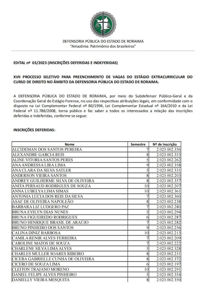 A Coordenação-Geral do Estágio Forense da Defensoria Pública do Estado (DPE-RR) publicou a relação das inscrições deferidas e indeferidas. Conforme o edital de abertura 001/2023, os candidatos têm até o dia 9 de outubro para apresentar recursos.Confira a lista preliminar das inscrições deferidas e indeferidas.