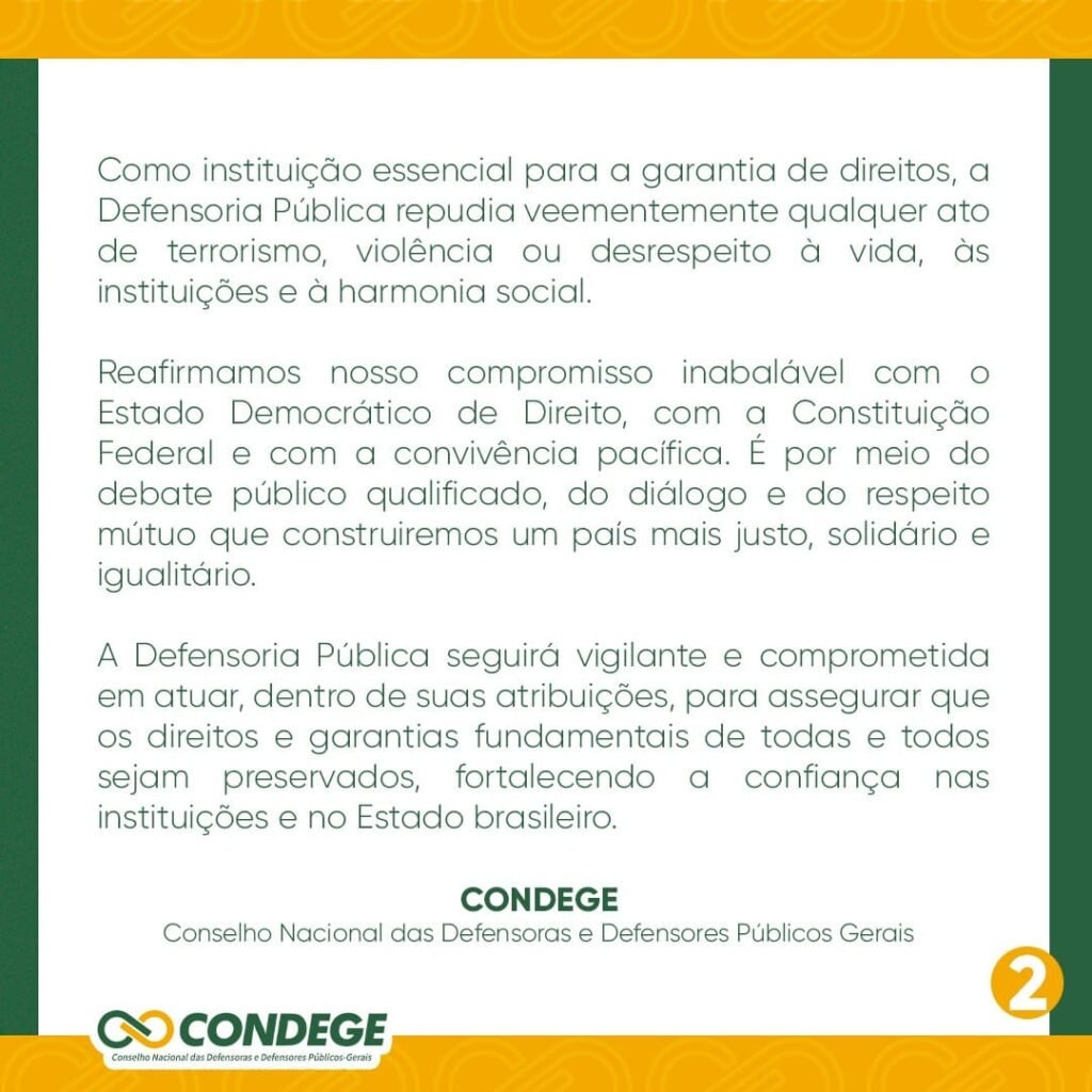 Como instituição essencial para a garantia de direitos, a Defensoria Pública repudia veementemente qualquer ato de terrorismo, violência ou desrespeito à vida, às instituições e à harmonia social.